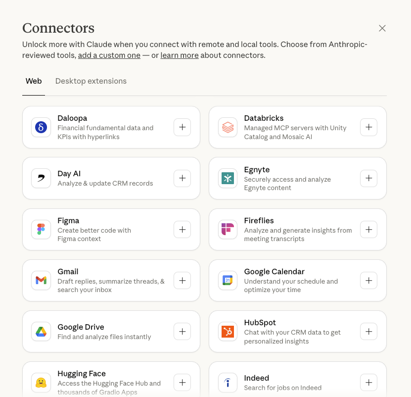 Go to New Chat in Claude and click Connect in the Search and Tools menu.