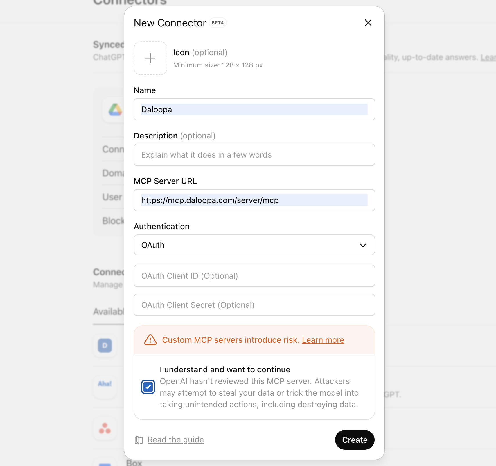 Click on "Add custom connector" and add our remote MCP server details. Please use https://mcp.daloopa.com/server/mcp as the server URL. Integration name can be according to user's preference.