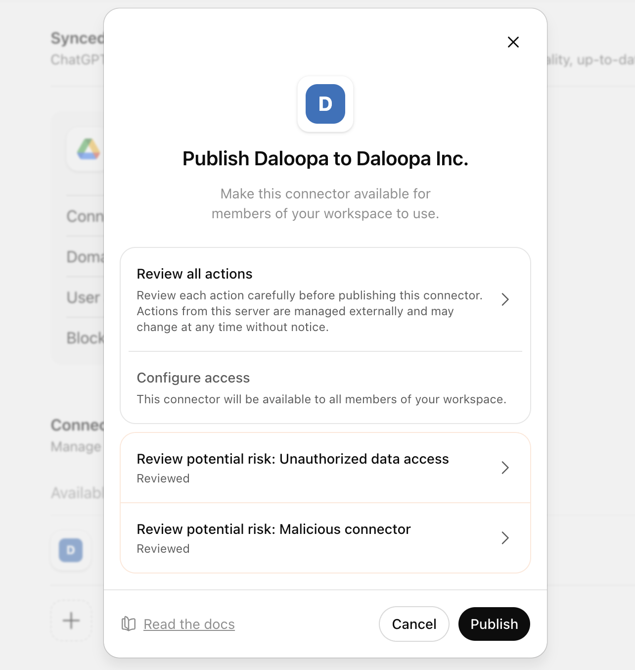 Review the two potential risk dropdowns, check the three checkboxes and hit publish