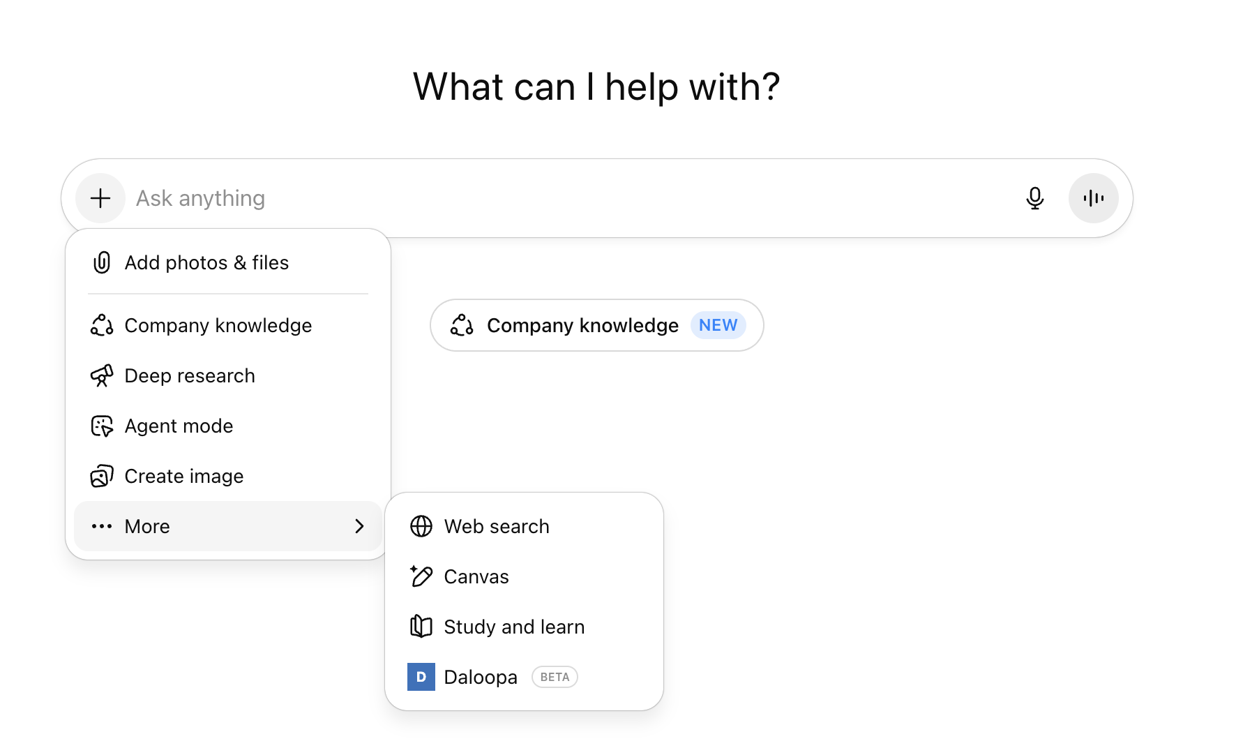 Go to a new chat, click the Add icon, go to the More menu and click Daloopa