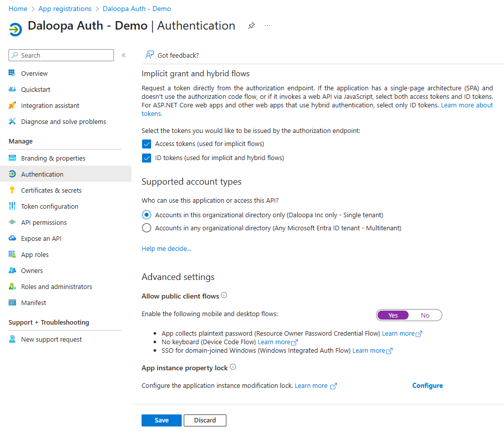- Under Advanced settings > Allow public client flows, select Yes for Enable the following mobile and desktop flows.
